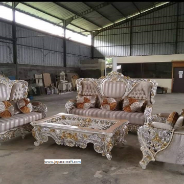 Kursi Tamu Sofa Mewah Bellagio White Kombinasi Gold Silver yang telah diukir dan juga kayu yang di pakai sudah dalam proses kering dan tua. Bahan yang kami gunakan untuk Kursi Tamu Sofa Mewah Bellagio White Kombinasi Gold dan Silver ini adalah kayu jati.